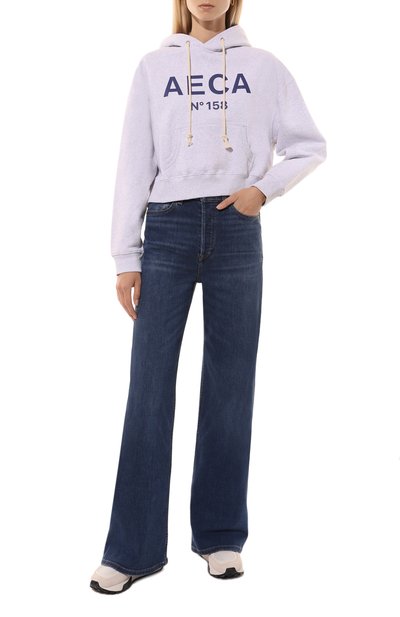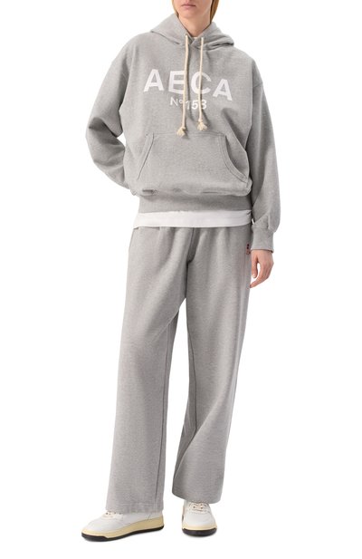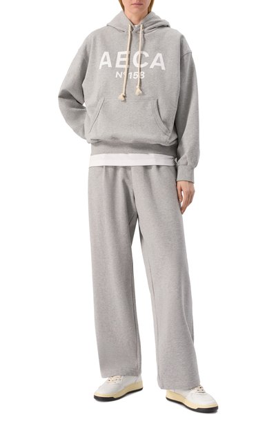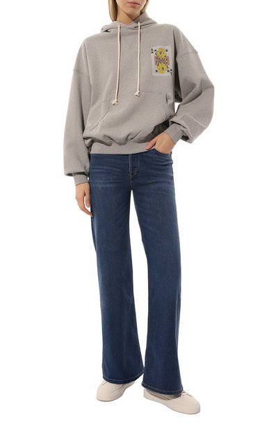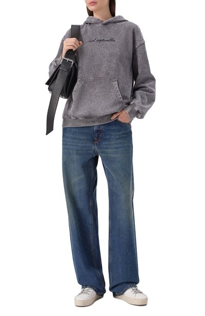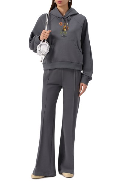 Худи силуэта oversize выполнено из хлопкового трикотажа. Меланжевая модель с манжетами и широким поясом в рубчик дополнена регулируемым капюшоном и карманом «кенгуру». Изделие украшено спереди логотипом марки.