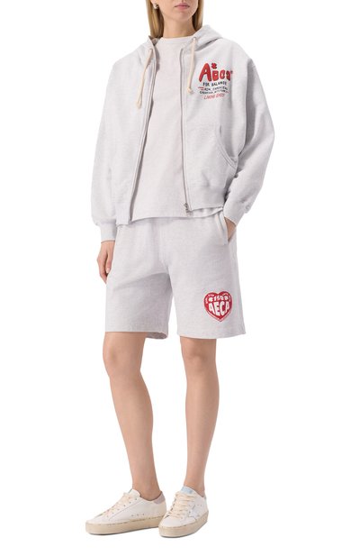 Толстовка с регулируемым капюшоном, заниженной линией плеч и двумя накладными карманами сшита из хлопкового футера. Модель с фирменным принтом спереди застегивается встречной молнией.