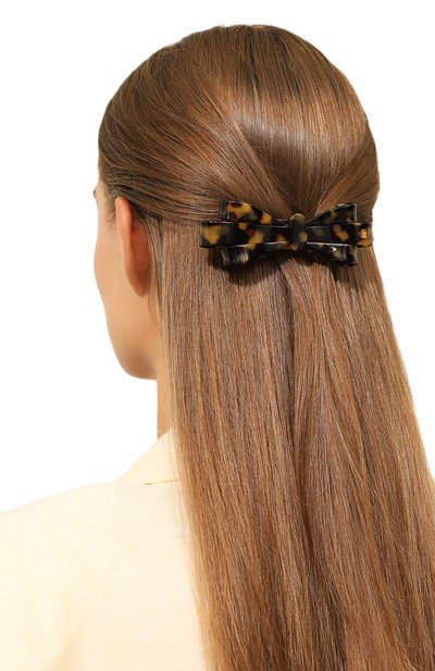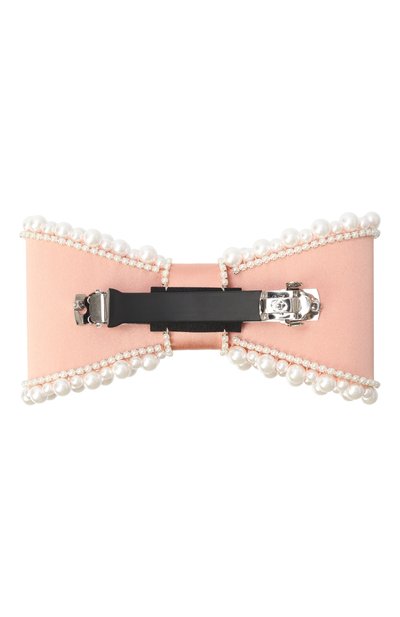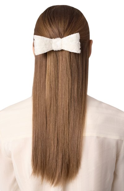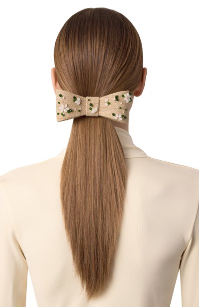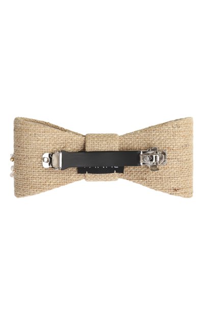 Заколку-бант выполнили шелкового жаккарда с цветочным мотивом, подчеркнутым бусинами. Чтобы металлический зажим-автомат не скользил по волосам, его обтянули силиконовым чехлом.