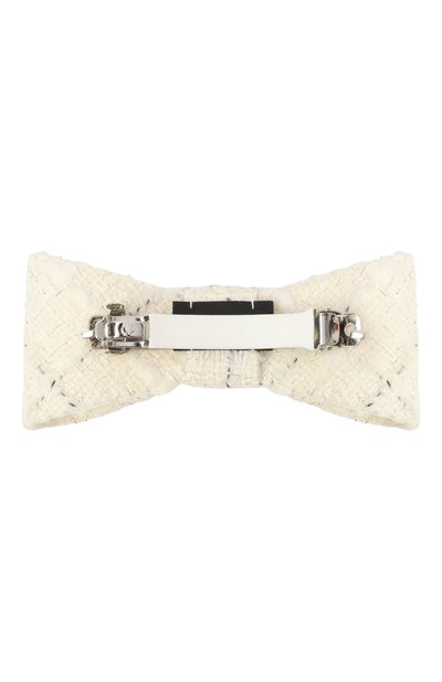 Заколку-бант с узким зажимом-автоматом выполнили из вискозного атласа с добавлением шелка и ацетата. Внутреннюю сторону аксессуара украсили фирменной пластиной.