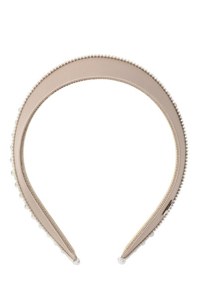 Обтянутый атласом кокошник украсили кантом из перламутровых бусин трех размеров. Аксессуар с лентой грогрен на внутренней стороне дополнили брендированной пластиной сбоку.