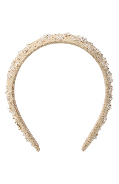 Кокошник с лентой грогрен изнутри выполнили из шелка, напоминающего льняной домотканый материал. Аксессуар украсили цветочным узором, выложенным разноцветными бусинами.