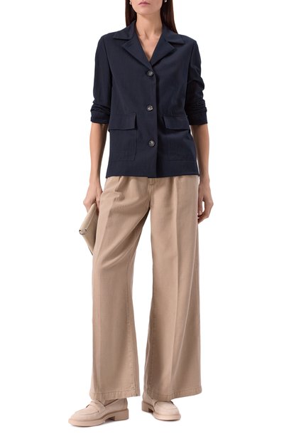 Широкие брюки с глубокими парными складками спереди и асимметричной застежкой выполнили из полушерстяной ткани стрейч. Модель дополнили боковыми карманами и прорезными задними.