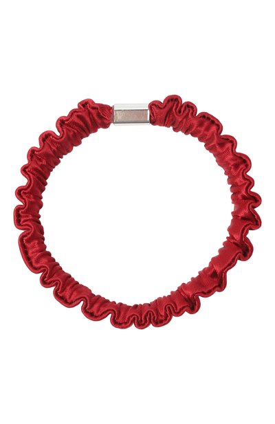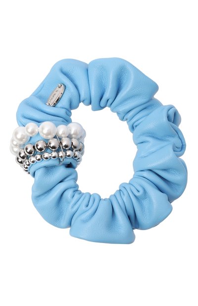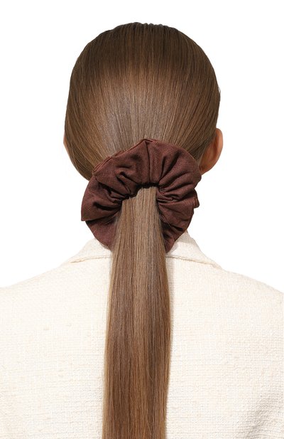 Резинку для волос изготовили из легко драпирующегося текстиля. Принадлежность аксессуара марке обозначили контрастной нашивкой с логотипом.