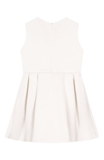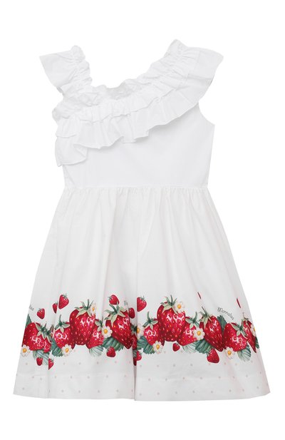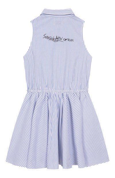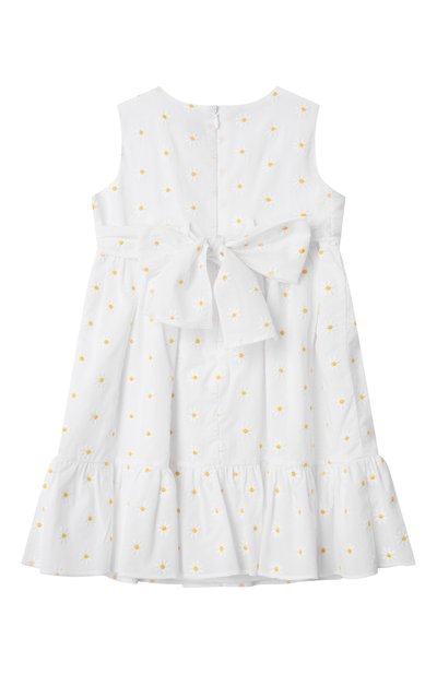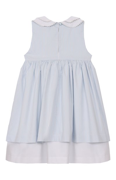 Платье с удлиненным нижним слоем на подоле выполнили из хлопка. Округлый двухслойный воротник изделия украсили кружевной каймой. Модель застегивается пуговицей на горловине сзади.