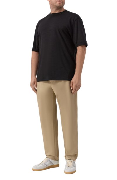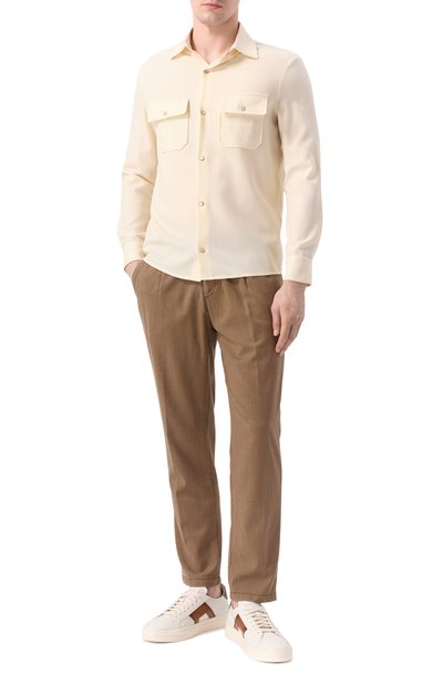 Брюки из чистой шерсти дополнили двумя врезными карманами по бокам и еще парой листочек сзади. Прямая модель со стрелками составит идеальный дуэт с парным пиджаком.