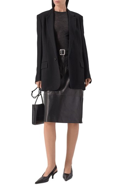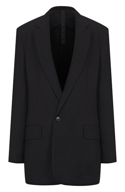 Однобортный oversize-жакет Gabriel без лацканов выполнили из костюмной ткани в узкую полоску, сотканную из микса шерсти и шелка. Модель с супатной застежкой дополнили тремя карманами.