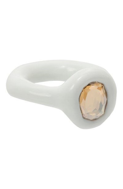 Массивное кольцо с тисненой эмблемой бренда выполнили вручную из полимерной глины. Украшение с лаковым покрытием дополнили овальным граненым кристаллом Swarovski.