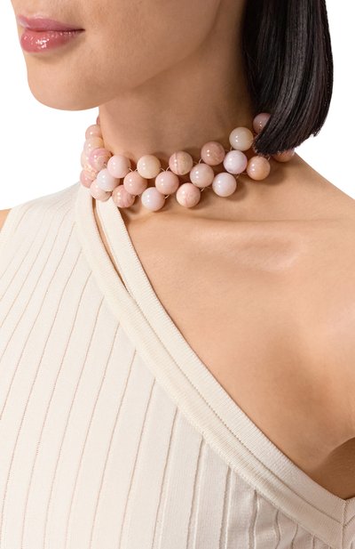 Три нити колье Summer Twist собрали из ограненных вручную розовых турквен итов. Регулируемый аксессуар с основанием из родированной латуни, украшенным кристаллами, застегивается небольшим карабином.