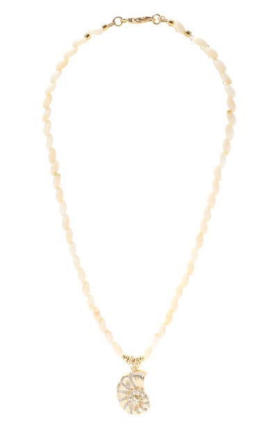 Колье Ariel собрано вручную из плоских коралловых бусин. Украшение с удлиняющей цепочкой и карабином дополнено позолоченной латунной подвеской-ракушкой с кристаллами циркона.