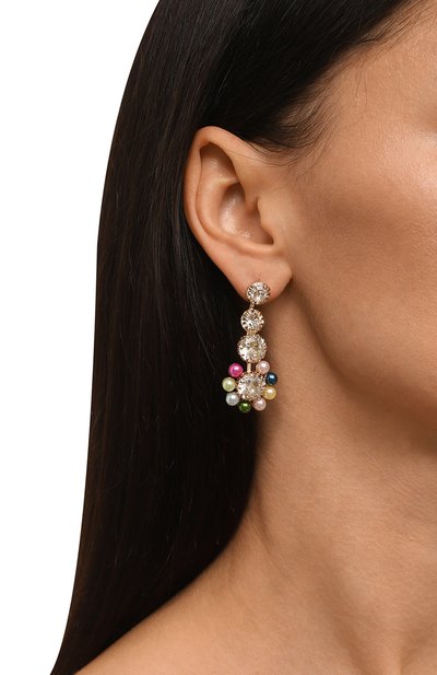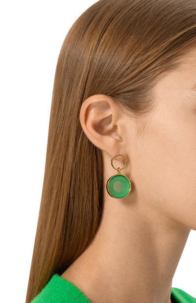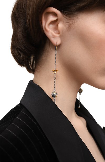 Серьги Avanture с рельефным круглым основанием изготовлены вручную из латуни с золотистым финишем. Длинная подвеска на цепочках дополнена полированным авантюрином, речным жемчугом и шармами с кристаллами.