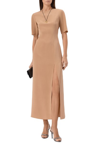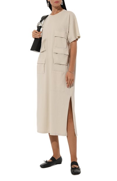 Расклешенное миди-платье с V-образным вырезом сшито из хлопкового поплина. Рукава дополнены патами. Модель с двумя врезными карманами застегивается потайной молнией сзади.