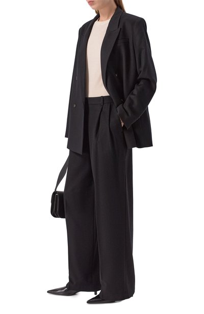 Брюки выполнили из шерстяной ткани с добавлением вискозы и полиэстера. Модель с карманами по бокам и парой листочек сзади дополнили отворотами и защипами, переходящими в отутюженные стрелки.