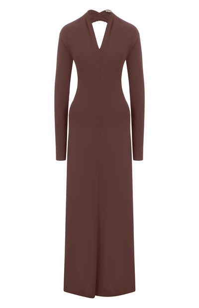 Макси-платье с длинными рукавами сшито из струящегося вискозного крепа с добавлением полиэстера. Глубокий фигурный вырез на спинке регулируется кулиской.
