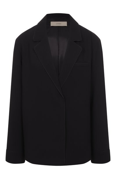 Однобортный жакет со спущенной линией плеч и узким кантом по краям сшили из полиэстера. Модель с широкими лацканами и нагрудным карманом застегивается потайными пуговицами.