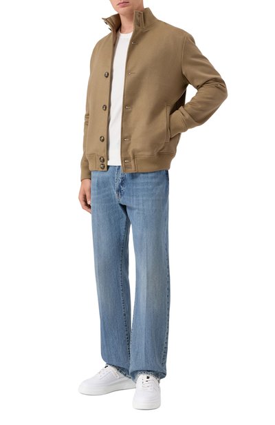 Бомбер с поясом-резинкой сшили из эластичной ткани на основе мерсеризованного длинноволокнистого хлопка. Помимо боковых карманов с клапанами у куртки на клетчатом подкладе предусмотрели два внутренних. Модель с отложным воротником застегивается встречной молнией, а манжеты – пуговицами.