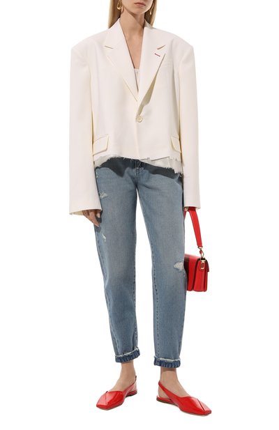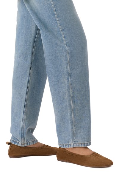 Балетки с круглым мысом выполнили из мелкозернистой козьей кожи шевро. Вдоль выреза материал собрали в мягкие складки, а на заднике предусмотрели петлю. Пару установили на тунитовую подошву с резиновым слоем.