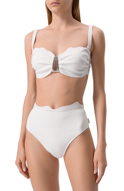 Бра-топ Bari выполнили из стрейчевого нейлона с фактурным узором, напоминающим парчу. Модель с декоративными кольцами на бретелях спереди дополнили поясом с застежкой сзади.