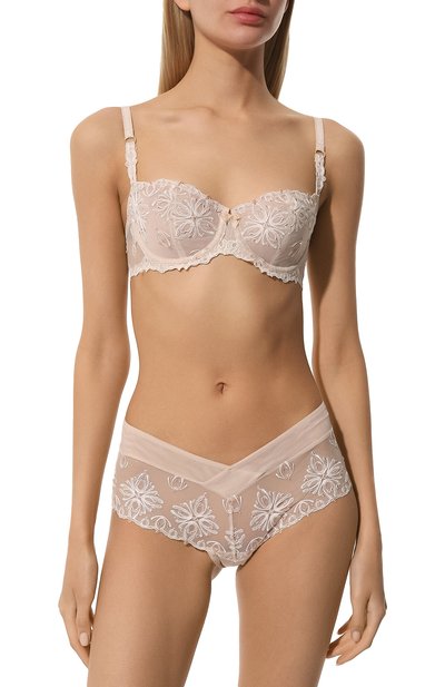 Бюстгальтер-балконет из кружева Dentelle Calais Caudry вошел в коллекцию Portofino. Модель с чашечками на косточках украсили атласной розой на перемычке, с которой перекликаются двойные регулируемые бретели.