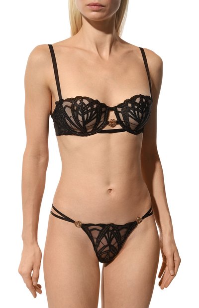 Трусы-танга выполнили из нейлоновой стрейчевой микрофибры и сетки с итальянской вышивкой. Трусы с хлопковой ластовицей дополнили широкими перемычками по бокам.