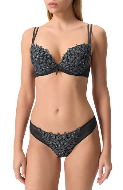 В коллекцию Roma вошел бюстгальтер с плотными чашечками и регулируемыми бретелями. Белье с широким поясом на крючках отделали цветочным кружевом с фестонами.