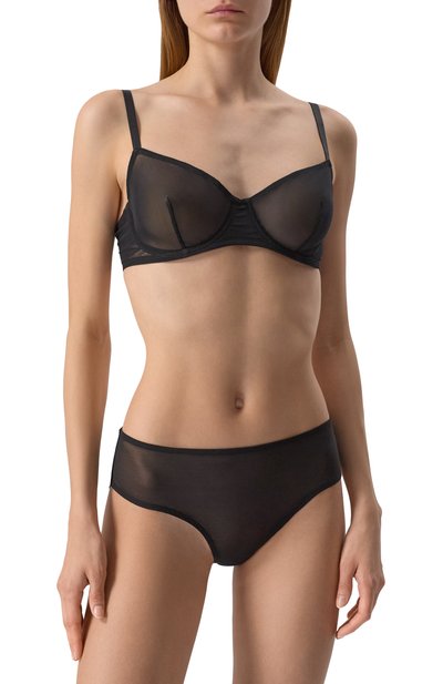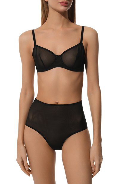 Бюстгальтер с мягкими треугольными чашечками выполнили из нейлонового тюля стрейч. Посадку модели из коллекции Uni можно регулировать бретелями со слайдерами и поясом с двумя крючками и тремя вариантами объема.