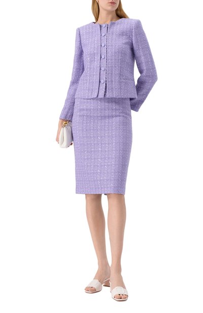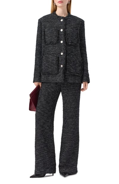 Жакет с подчеркнутой линией плеч выполнили из твида, которому добавили блеска металлизированными нитями. Укороченная модель застегивается акцентными пуговицами.