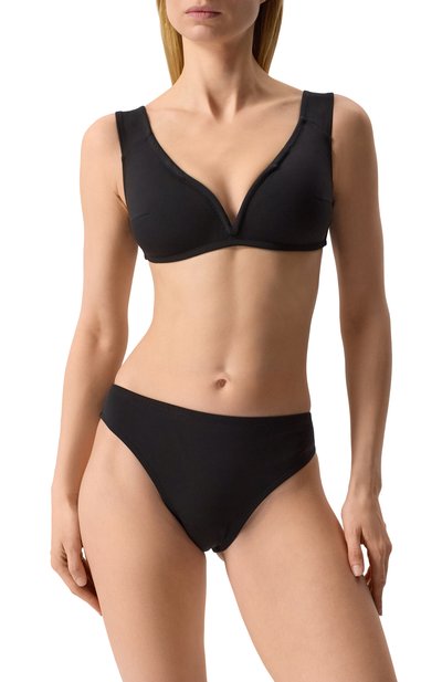 Бра-топ с глубоким V-образным вырезом сшили из матовой лайкры. Модель с широким эластичным поясом, регулируемыми бретелями и брендированной застежкой украсили овальными вырезами с тюлевыми вставками.