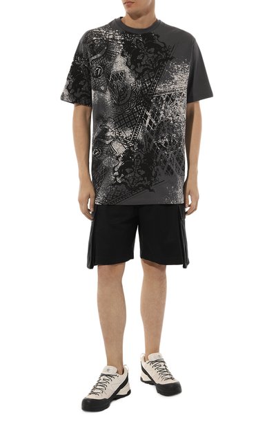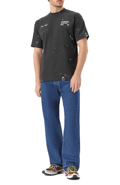 Футболку прямого кроя выполнили из эластичного хлопкового трикотажа. Модель с брендированной металлической накладкой на спинке окрасили в готовом виде.