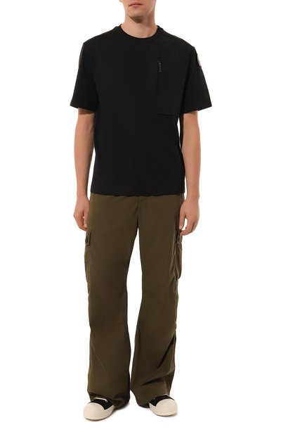 Футболку из хлопкового трикотажа стрейч состарили при помощи необработанных краев и неравномерного текстурного окрашивания, которое выполнили вручную. Горловину изделия сзади дополнили фирменным шнуром с брендированным фиксатором.