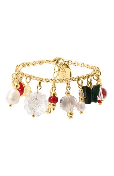 Для изготовления браслета-цепочки использовали гипоаллергенный металл с золотистым покрытием. Украшение с застежкой-карабином дополнено подвесками из эпоксидной смолы, жемчужин и стекла.