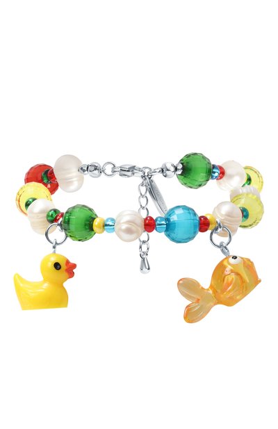 Регулируемый браслет-цепочку выполнили из металла. Аксессуар с застежкой «лобстер» украсили брендированной пластиной и фигурными подвесками.