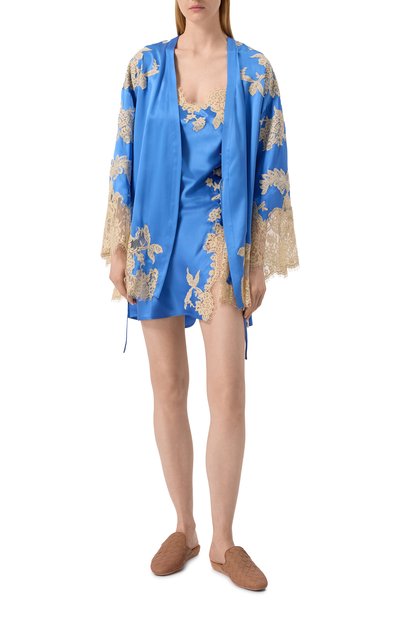 Для пошива халата Appoline с поясом, продетым в шлевки, использовали шелковый атлас. Спинку, плечи и расклешенные рукава декорировали цветочным кружевом кале.