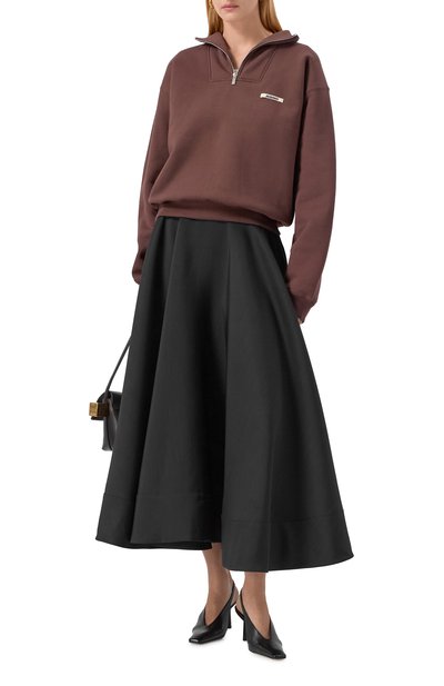 Свободный свитшот со спущенной линией плеч выполнили из хлопкового трикотажа, смешанного с полиэстером. Словно слегка выцветшее изделие украсили спереди контрастным вышитым логотипом марки. Высокий воротник застегивается молнией.