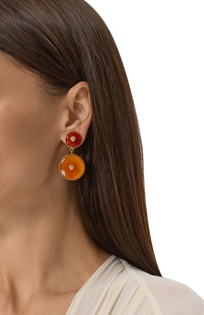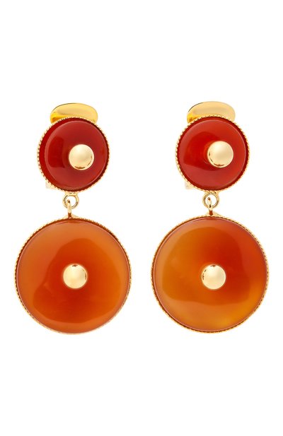 Для изготовления крупных клипсов использовали позолоченную латунь. Основание и подвеску в форме дисков украсили блестящими сферами и полированными вставками из кварца и агата.