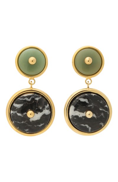 Крупные клипсы выполнили из позолоченной латуни. Круглые основание и подвеску декорировали полированными вставками из цветных полудрагоценных камней.