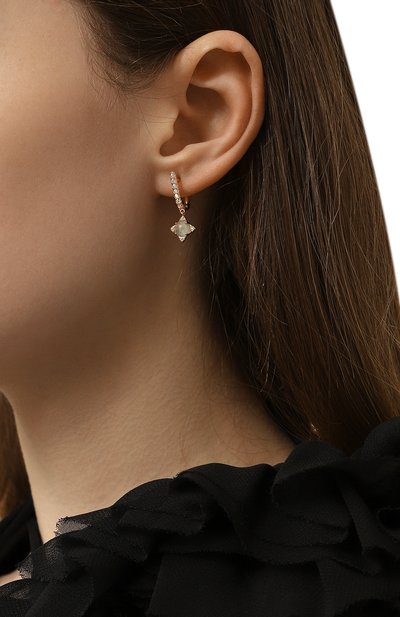 Асимметричные серьги «Небо» из латуни декорировали топазами круглой огранки. Одну из пары серег дополнили цепочкой якорного плетения, звенья которой украсили выгравированным узором.
