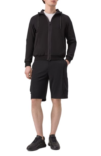 Бомбер с двумя врезными карманами сшит из хлопкового трикотажа. Куртка с эластичными манжетами и широким поясом застегивается встречной молнией с брендированным пуллером.