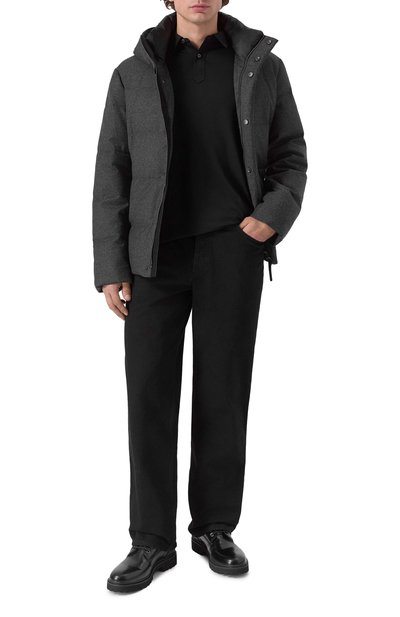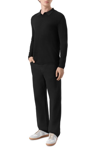 Поло Omelly прямого кроя сшили из тонкого шерстяного трикотажа. Изделие с V-образной горловиной, манжетами и поясом в рубчик украсили металлической эмблемой бренда сбоку.
