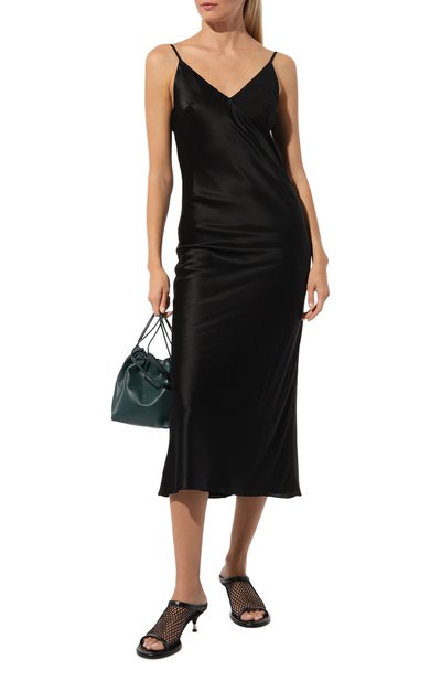 Платье-комбинацию с V-образными вырезами выполнили из атласа на основе вискозы и полиэстера. Низ модели подчеркнули отделкой из контрастного кружева.