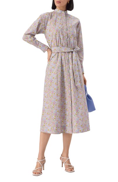 Платье-рубашку с воротником-стойкой выполнили из хлопка с графичным принтом. Модель с прямоугольными манжетами и супатной застежкой дополнили боковыми карманами. В комплекте — пояс-лента в тон.