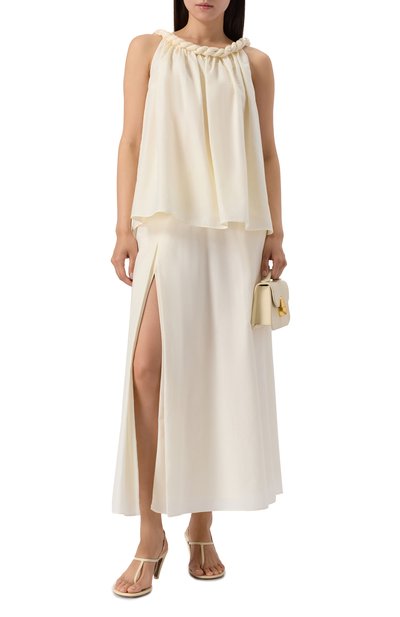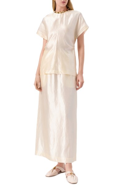 Миди-юбку выполнили из блестящего атласа на основе вискозы с добавлением полиэстера. Модель с мягкими складками на слегка расклешенном низе дополнили потайной застежкой сбоку.