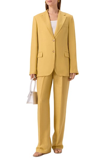 Двубортный жакет с прямоугольными лацканами сшили из вискозы. Oversize-модель со складками на рукавах дополнили боковыми карманами с клапанами.