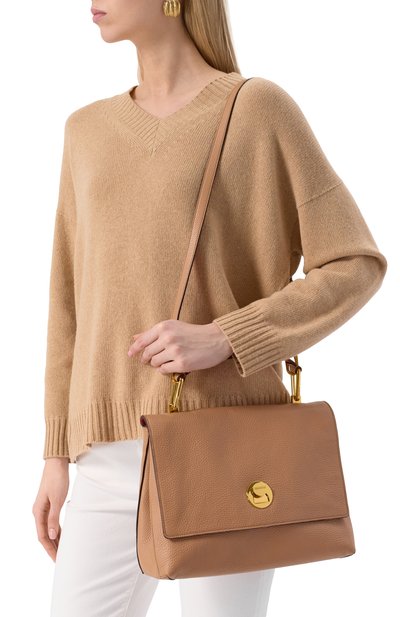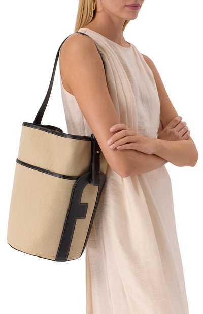 Сумку-ведро Lido с отделкой из гладкой телячьей кожи выполнили из плотной парусины. Аксессуар с регулируемой ручкой затягивается кулиской с фиксатором на шнуре. Сбоку – крупная аппликация в виде эмблемы Arch.
