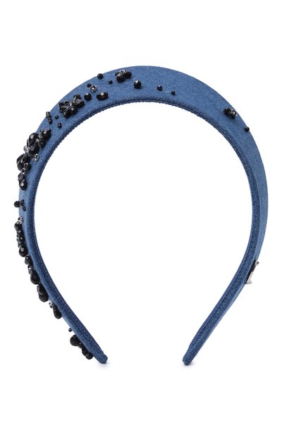 Каркас ободка-кокошника с репсовой лентой на внутренней стороне обтянули денимом. Аксессуар украсили брендированной пластиной и цветочным узором из стеклянных бусин.