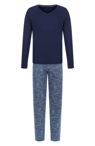 Пижама из линии Night & Day сшита из гладкого хлопкового джерси. Комплект состоит из однотонного лонгслива с V-образным вырезом и принтованных брюк с двумя карманами.