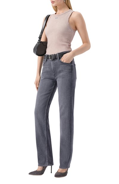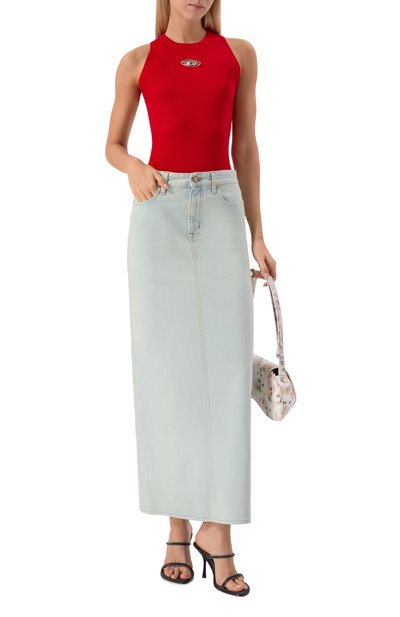Для изготовления облегающей майки с глубокими проймами использовали трикотаж в рубчик, связанный из хлопковой пряжи с добавлением кашемира. Однотонная модель с круглым вырезом легко впишется в повседневные образы.