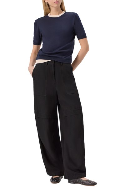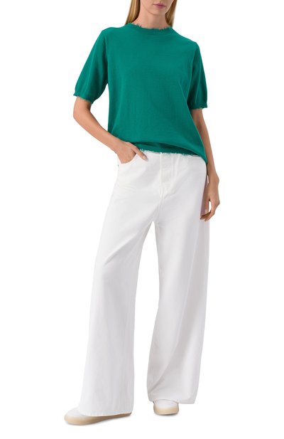 Пуловер со спущенными петлями на ребристых манжетах, поясе и горловине станет акцентной деталью в повседневном образе. Модель прямого кроя выполнили из хлопкового трикотажа с добавлением кашемира.