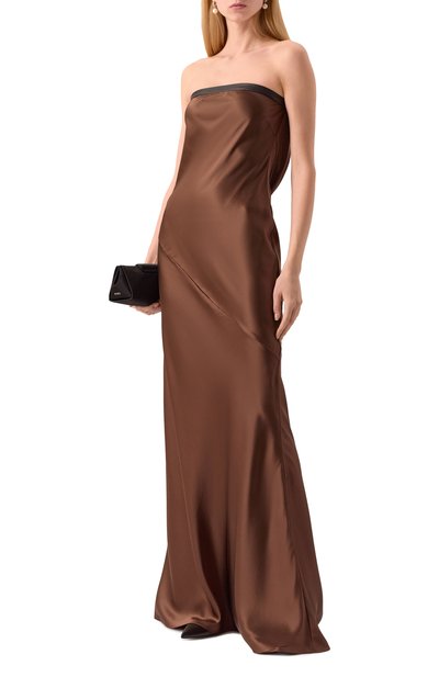 Длинное платье-бюстье с драпировкой и длинными завязками на лифе выполнили из вискозы с принтом. Модель застегивается потайной молнией сзади.