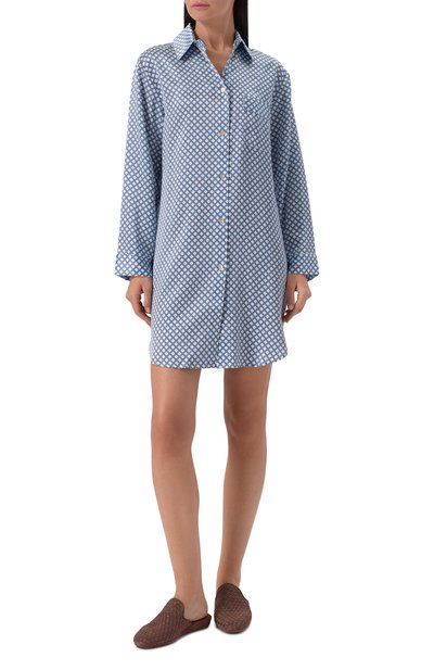 Домашнее платье-рубашку со встречной складкой на спинке сшили из шелкового атласа. Модель с закругленной линией низа дополнили накладным нагрудным карманом.